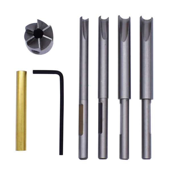 3/4 cutter head with 6 edges, wrench and the 4 different size shafts (6.18mm,7.2mm,8.64mm,9.15mm)